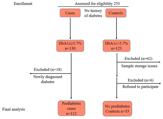 During the laboratory phase, 62 samples were excluded due to storage issues. Additionally, at the data analysis stage, 24 participants were excluded following the diagnosis of new-onset T2DM. Consequently, data from 167 participants, 112 cases, and 55 controls were included in the final analysis (Figure 1).