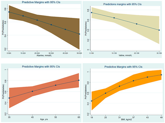 Separated predictive margins of Alanine, Valine, age, and BMI for prediabetes in binary LR models.