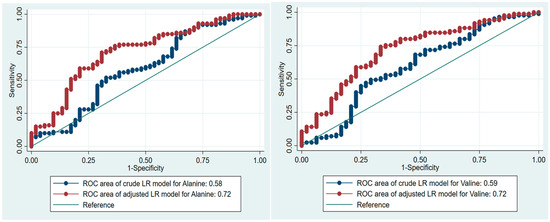 ROC areas of LR model for Alanine and Valine in the prediction of prediabetes, crude and adjusted for age and BMI.