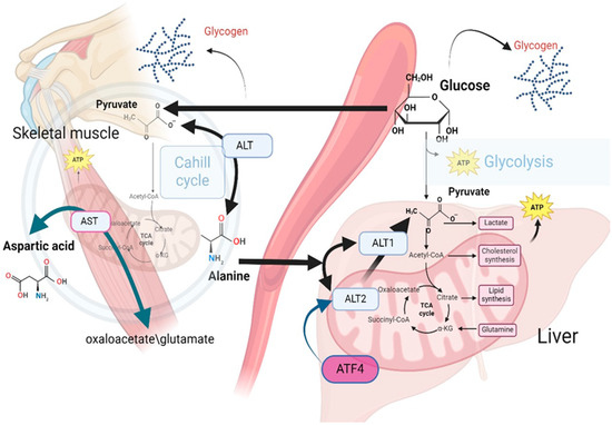 ALT catalyzes the conversion of pyruvate to Alanine in muscle cells. This transamination reaction facilitates the conversion of Alanine and α-ketoglutarate into pyruvate and glutamate [62]. Alanine serves as a vehicle for the transport of amino groups from peripheral tissues to the liver, where Alanine is reconverted to pyruvate, facilitating its subsequent utilization in gluconeogenesis. This pathway is particularly vital during periods of fasting or intense physical exercise. While ALT is predominantly found in the liver, it is also present in other tissues, including the kidneys, heart, and muscle cells, highlighting its importance in amino acid metabolism across different physiological contexts [63] (Figure 4).