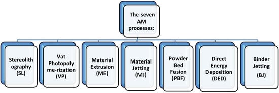 Monteiro et al. outline seven types of 3D-printing applications, dependent on the materials and printing requirements, each with its advantages and limitations [6]. Moreover, novel 3D-printing materials, such as smart materials, ceramics, electronics, biomaterials, and composites, are shaping the prospect of pharmaceutical manufacturing [7]. Among these applications, our focus in this paper is on some key elements of new derivates based on seven fundamental AM (additive manufacturing) 3D-printing technologies (Figure 1). These encompass stereolithography (SL), which employs ultraviolet light to cure the liquid resin layer for the formation of a solid object. Vat photopolymerization (VP) is responsible for solidifying liquid resin using ultraviolet light emitted from a vat, producing multiple layers. Material extrusion (ME) is a process that involves pushing bond-ready material through a heated nozzle in order to deposit it in successive layers, while material jetting (MJ) selectively deposits droplets of material onto a substrate. Powder bed fusion (PBF) selectively fuses layers using a laser or electron beam, whereas direct energy deposition (DED) melts the material and deposits it layer by layer using a focused energy source. Finally, binder jetting (BJ) deposits a binding agent onto a bed of powder to create layers [7].