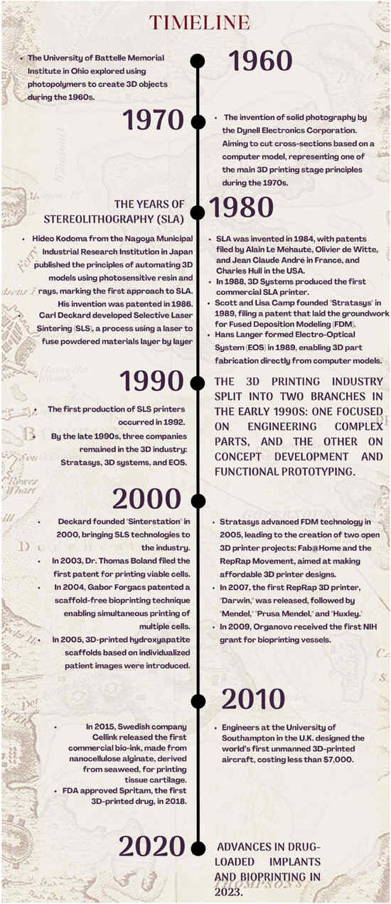 To provide a concise overview of the key milestones in the development of 3D printing technology, a timeline summarizing the historical progression from the 1960s to the present has been included in Figure 2.