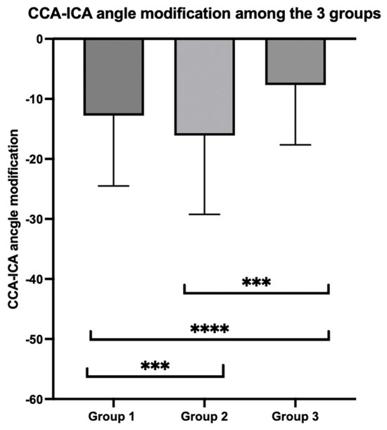 Mean differences in CCA-ICA angle modification among the three subgroups. **** for p < 0.001 and *** for p < 0.01.