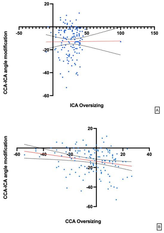 (A) Linear regression analysis of CCA-ICA angle modification and ICA stent oversizing; (B) linear regression analysis of CCA-ICA angle modification and CCA stent oversizing.