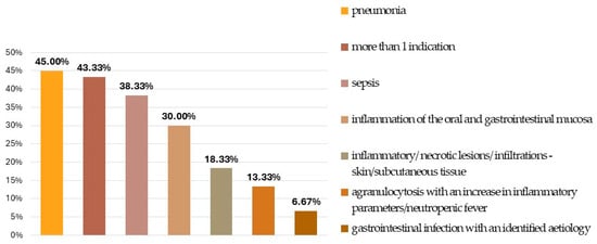Bacterial pneumonia and sepsis were the predominant indications for GC transfusion; in addition, oral mucositis, gastrointestinal infection, and inflammatory/necrotic/infiltrative lesions located on the skin or subcutaneous tissue also had a non-negligible frequency. Twenty-six patients (43.3%) had more than one infection foci (Figure 1).