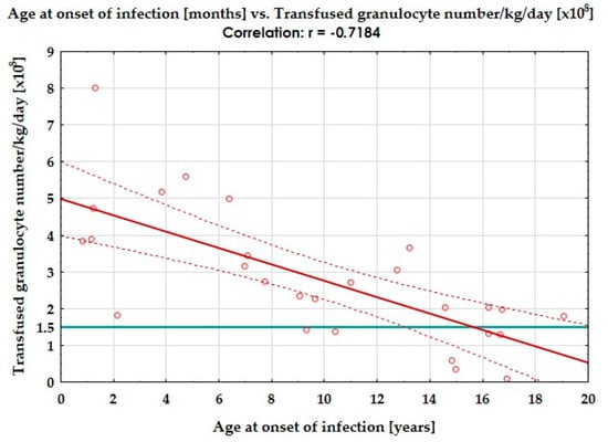 The correlation between the patient’s age and the received number of granulocytes per kilogramme of body weight per day. Continuous red line—the graphical representation of negative correlation; dashed orange lines—the 95% confidence intervals for the correlation line; orange dots—the single records; turquoise solid line - the border above which the number of granulocytes in GC was sufficient.