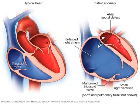 - Yuan, S.M. Ebstein’s Anomaly: Genetics, Clinical Manifestations, and Management. Pediatr. Neonatol. 2017, 58, 211–215. [Google Scholar] [CrossRef]