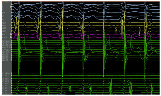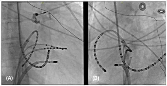 The first is a 27-year-old woman with mild EA and moderate TR (discussed earlier in Figure 2A,B). She was taken to the EP laboratory for progressively symptomatic tachycardia. The following figures show fluoroscopy images (Figure 4A,B) and electrograms (Figure 5, Figure 6, Figure 7, Figure 8 and Figure 9), the electroanatomic map, and ablation lesions. She was found to have multiple pathways—an atriofascicular (Mahaim) pathway and a retrograde left lateral pathway, which participated in ORT. Both pathways were ablated, and thus far, she has had no recurrence. Detailed descriptions of the study findings are present in the figure text.
