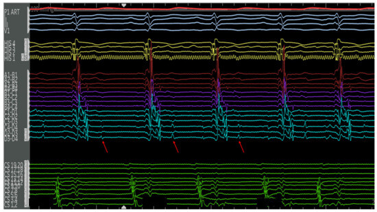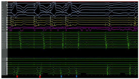 Ventricular extrastimulus testing revealed multiple retrograde atrial activations, including an earliest atrial activation in the distal CS (red arrows). This finding was reproducible, suggesting the presence of a left lateral pathway. The atrial activations of the extrastimulus beats (blue arrows) possibly represent fusion with the pathway. The VA times are stable for the first two beats (left lateral pathway) and decremental, following the vetricular extrastimuli. The a VH is stable and HA is decremental, suggestive of retrograde conduction through the AV node.