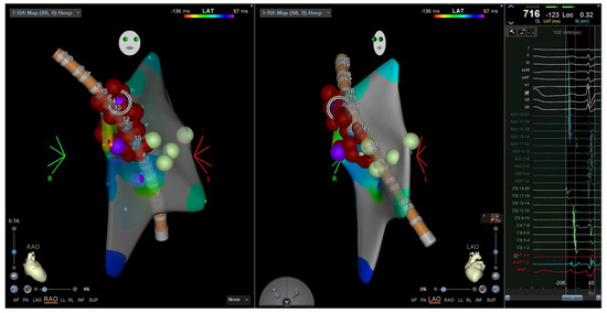 Electroanatomic map showing an RAO (left) and LAO (middle) view of the A20 catheter and radiofrequency ablation lesions in the lateral tricuspid annulus corresponding to the EGM of the pathway potential and earliest point of activation (right). Catheter positions were previously described in Figure 4. RAO = right anterior oblique. LAO = left anterior oblique. EGM = electrogram.