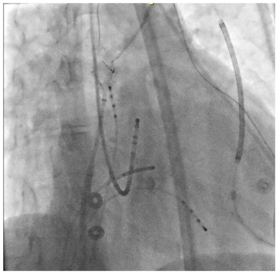 An RAO view is shown of the catheters for this electrophysiological study. There are quadripolar catheters present in the right atrium and ventricle. The His octapolar catheter and CS duodecapolar catheters are present in standard positions. A PentaRay mapping catheter present within a steerable sheath in the high right atrium. Patient’s subcutaneous ICD lead is also visualized.