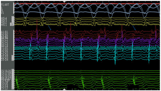 The second case is a 50-year-old woman with EA with a severely apically displaced TV (TV displacement index 19.8 mm/m2) on sotalol due to ventricular tachycardia (cycle length of 300 milliseconds) discovered incidentally during an unrelated hospitalization years earlier. Following multiple episodes of syncope, a subcutaneous ICD was placed. After receiving a shock, she was taken to the EP lab for the study and ablation of her ventricular tachycardia. Her clinical ventricular tachycardia is illustrated in Figure 10, Figure 11, Figure 12, Figure 13, Figure 14 and Figure 15 below. Her electrograms were notable for the highly fractionated and delayed ventricular electrograms in sinus rhythm in the inferior wall of her atrialized right ventricle. Her clinical ventricular tachycardia was similar to two of the four VTs elicited. However, hemodynamic instability limited extensive entrainment. Extensive substrate ablation was performed with radiofrequency ablation in the inferior wall of the right ventricle. There have been no known recurrences.
