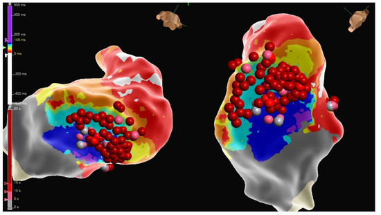 Substrate ablation was performed on the areas of interest identified in the electroanatomic mapping. A local activation timing map is displayed.