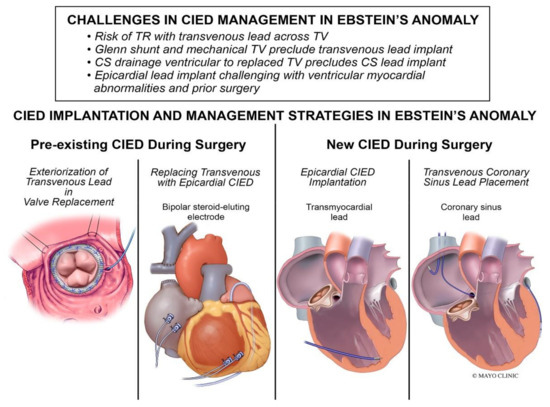 Management of cardiac implantable electronic devices (CIEDs) can be challenging (Figure 16). A retrospective review by Tan et al. found that among 93 patients with Ebstein’s anomaly and a CIED procedure, 48% (n = 45) received a CIED at the time of tricuspid valve surgery, and 82% (n = 37) of the CIEDs implanted during surgery were epicardial systems [30]. The same study found that among patients with pre-existing transvenous RV leads at the time of tricuspid valve surgery (n = 20), the RV lead was externalized in 75% of patients (n = 15) and was extracted with the epicardial lead implantation in 25% of patients (n = 5) [30].