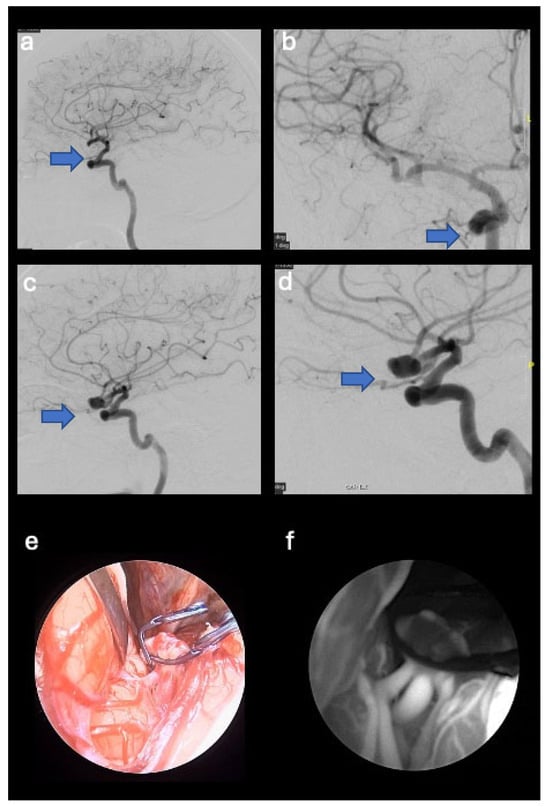 Pre- and postoperative digital subtraction angiography images that show right multilobed middle cerebral artery aneurysm (blue arrows) (M1-M2 union) (a,b). Postoperative digital subtraction angiography image of the excluded aneurysm (c,d). Standard endoscopic view (e) and endoscope in the SPY mode (f).