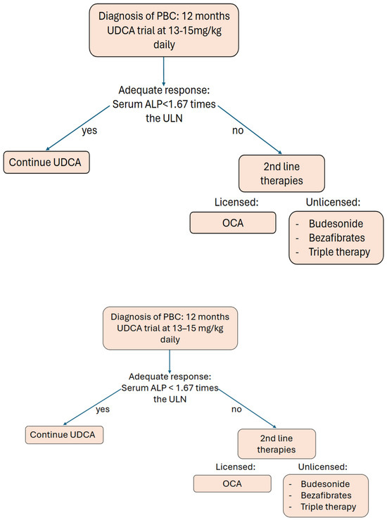 EASL as well as BSG recommend that the management of PBC should involve the use of UDCA in all patients, and then, the patient’s biochemical response should be reassessed after 1 year to identify high-risk patients [15,16], where inadequate response indicates using OCA as a dual therapy. These are patients that have an ALP > 1.67× ULN and bilirubin < 2× ULN. OCA is also used in monotherapy in patients that cannot tolerate UDCA. Alternate therapies are not currently licensed, and as such, EASL and BSG maintain that a recommendation regarding budesonide and bezafibrate cannot be made.