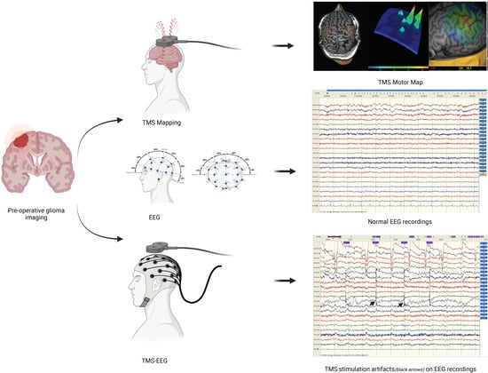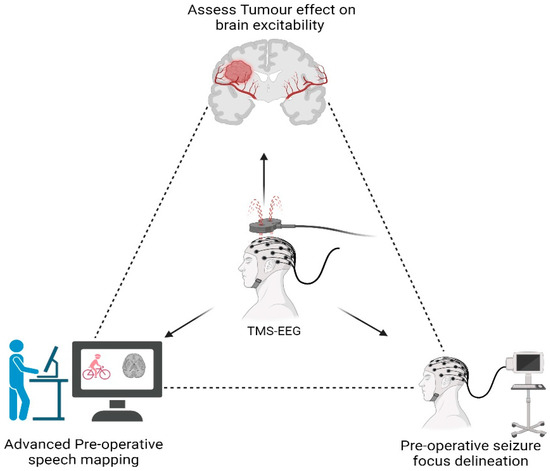 Vucic, S. et al. [35] review the clinical advancements of various TMS techniques, including TMS-EEG, though the article does not exclusively focus on neurosurgical applications. The authors highlight that TMS-EEG can provide a better understanding of how brain tumors influence cortical excitability. This is achieved by analyzing TMS-evoked potentials (TEPs), which are deflections induced in the EEG recordings after a TMS stimulus. The characteristics of these potentials—latency, spread, and directionality—can offer valuable insights into how the tumor affects both the targeted function or tumor-involved brain areas and the surrounding regions. The brain state-dependent effects of TMS suggest that the optimal therapeutic or mapping target may vary based on the patient’s brain state, which can be characterized using EEG. While the paper emphasizes the potential of TMS-EEG in assessing tumor–brain interaction, it does not offer specific metrics or standardized protocols for evaluating tumor-induced changes in brain excitability. This gap in the literature indicates a need for further studies to establish clear guidelines for clinical practice.