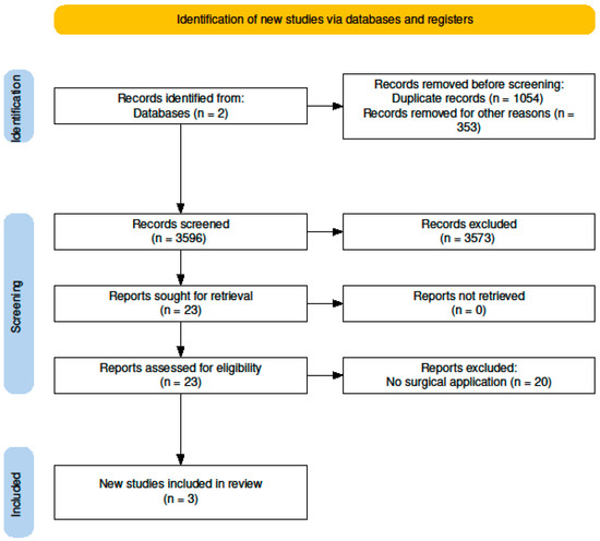After eliminating all stroke-related papers, 23 full papers were assessed further for surgical application. Of these, 3 met our inclusion criteria and were included in this review. All search terms and the number of papers for each year are included in the Appendix A, Figure A1 and Table A1.