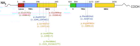 Schematic representation of the locations of variants included in the studied complex alleles in the CFTR protein. Font color indicates variants found on one allele: green—[L467F;F508del]; orange—[S466X;R1070Q]; red—[E217G;G509D]; blue—[F1052V;1367del5].