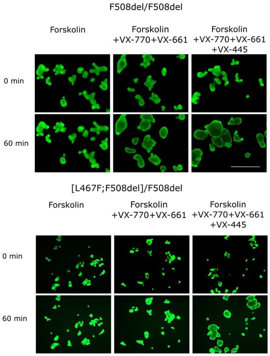 Images of intestinal organoids obtained from [L467F;F508del] CA individuals and from the F508del/F508del control culture before forskolin (5 μM) and targeted drug application (0 min) and 60 min after the treatment. Calcein staining (0.84 µM, 1 h), 5X objective, scale bar = 500 µm.