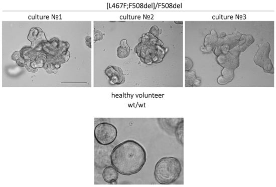 Cultures of IOs obtained from individuals bearing the [L467F;F508del] complex allele with the F508del variant in a compound heterozygous position and a healthy donor (wt/wt CFTR) are shown on Figure 3. The CF-derived cultures manifest morphological features of a dysfunctional CFTR channel, including characteristic thickening of the walls of the organoids, the absence of the lumen, and an irregular shape, in contrast to the culture derived from a healthy individual. The organoids with wt/wt CFTR possess a regular spherical shape, thin walls, and a clearly defined lumen (Figure 3).