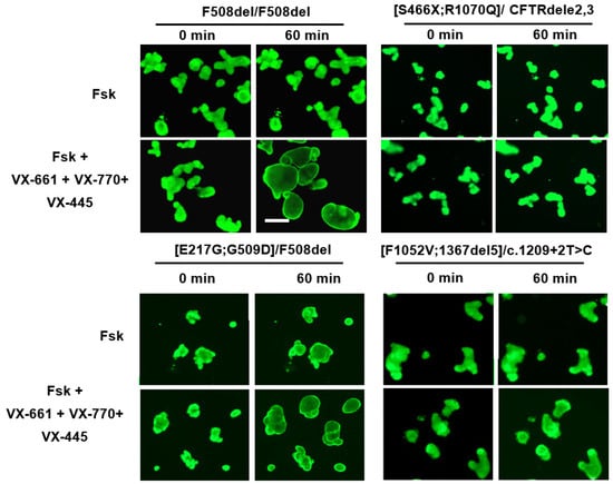 Study of residual CFTR channel function (forskolin response) and therapeutic effect of the triple ETI (VX-770 + VX-661 + VX-445, each at a concentration of 3.5 μM) combination in IOs derived from individuals with different CAs. F508del/F508del—control; forskolin concentration—5 µM; scale bar—200 µm.