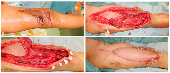- Kwiecien, G.J.; Lamaris, G.; Gharb, B.B.; Murray, T.; Hendrickson, M.F.; Zins, J.E.; Isakov, R. Long-Term Outcomes of Total Knee Arthroplasty following Soft-Tissue Defect Reconstruction with Muscle and Fasciocutaneous Flaps. Plast. Reconstr. Surg. 2016, 137, 177e–186e. [Google Scholar] [CrossRef] [PubMed]