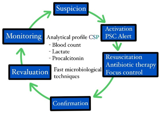 From a practical point of view, when sepsis or septic shock are suspected (based on scales such as “quick SOFA” (qSOFA) or the systemic inflammatory response syndrome (SIRS)) or confirmed (based on the sequential organ failure assessment (SOFA) score), the clinician in charge of the patient activated the PSC alert in the computer system, and from that moment on, the patient received priority care, including rapid analytical, microbiological testing (determining the causal microorganism in approximately 1 h, which is routinely determined in 12–24 h, and its antibiogram in 7 h, which is routinely determined in 72–96 h); rapid radiological testing; the initiation of treatment with resuscitation and antibiotic therapy; the control of the infectious focus in an invasive manner, by surgical intervention or interventional radiology; and assessment and admission to the medical and surgical ICU, if the evolution continued to be unfavorable, despite treatment (Figure 2).