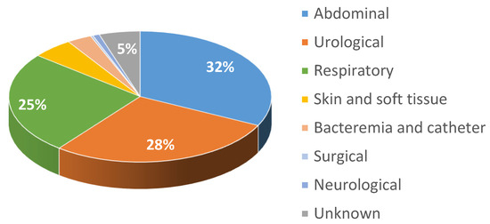 In our study, we found that the most frequent focus of sepsis was abdominal, followed by urological and respiratory; however, this is not common, with the respiratory focus being the most frequent focus noted in clinical series and trials [2,34,35].