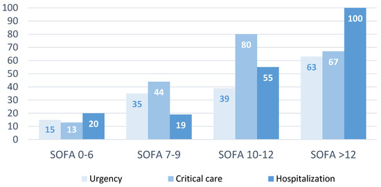 Figure 5 shows the percentage of mortality according to the SOFA scale and the department in which the PSC activation was carried out. It should be noted that patients with SOFA scores higher than 12 whose PSC alerts were activated on the hospitalization floor exhibited a 100% mortality rate.