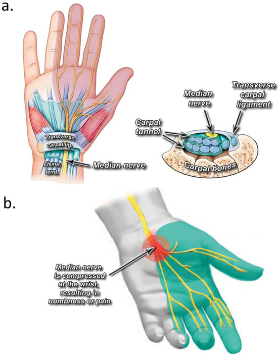 (a) Anatomy of the carpal tunnel; (b) median nerve’s site of compression in the carpal tunnel. Reprinted from Osiak et al., 2022 [7].