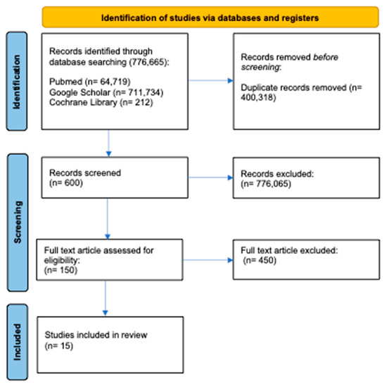 Studies were identified through a search of three databases (PubMed, Google Scholar, and the Cochrane Library). A total of 776,665 articles were extracted, with 64,719 coming from PubMed, 711,734 from Google Scholar, and 212 from the Cochrane Library. Studies were selected for inclusion based on their relevance to the review, and duplicates were excluded (n = 400,318). After removing review articles, unpublished studies, meta-analyses, case studies, practical guidelines, and books (n = 776,065), the full text of the remaining 150 articles was assessed for eligibility. Ultimately, 15 research articles were included in the review (Figure 2) [21,34,35,36,37,38,39,40,41,42,43,44,45,46,47].
