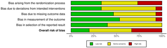 The risk of bias graph is reported in Figure 3. The overall level of risk of bias in all of the studies retrieved in this systematic review showed some concerns about the randomization process (selection bias), deviations from the intended intervention (performance bias), blinding of the outcome assessment (detection bias), incomplete measurement of the outcome data (attrition bias), and selective reporting of the results (reporting bias). More specifically, 47% of the studies highlighted some concerns, while 33% of them had a high risk of bias, and only 20% of them resulted having a low risk of bias.