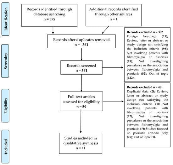 MedLine (via PubMed), Web of Science (WOS). And Cochrane Central Register of Controlled Trials (CENTRAL) databases were searched up to 10 March 2023. The main search in MedLine was performed using the string “(fibromyalgia” OR “chronic fatigue syndrome” OR “chronic fatigue disorder”) AND (“psoriasis” OR “psoriatic arthritis” OR “spondylarth*”)”, while the main search in CENTRAL was performed using the string “(“fibromyalgia” OR “chronic fatigue syndrome” OR “chronic fatigue disorder”) AND (“psoriasis” OR “psoriatic arthritis” OR “spondyloarthritis”)”. Finally, the main search in WOS was performed using the string “[TS= ((“fibromyalgia” OR “chronic fatigue syndrome” OR “chronic fatigue disorder”) AND (“psoriasis” OR “psoriatic arthritis” OR “spondylarth*”))]”. Additionally, relevant keywords were used in different combinations for free-hand search, and the bibliography of selected articles was reviewed. The decision to include the keywords “chronic fatigue syndrome” was adopted to increase the sensitivity of the search strategy (e.g., identification of studies centered on chronic fatigue syndrome (CFS) but also including individuals satisfying criteria for FM, given the clinical overlap between the two clinical entities), although the focus of our article was FM. A similar rationale was used for including the keywords “psoriatic arthritis” and “spondyloarthritis”.