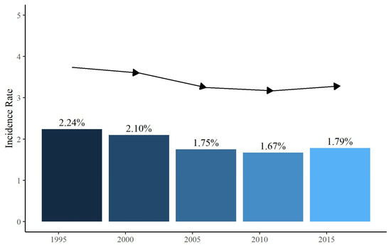Incidence rate of Stroke After Cardiac Surgery (SACS) at 5 years (from 1995 to 2015).