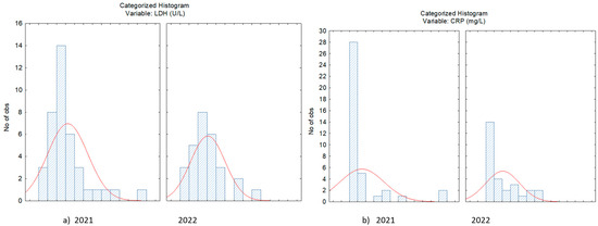 Distribution of LDH (a) and CRP (b) concentration in case of patients with SARS-CoV−2 infection evaluated in 2021 and 2022.