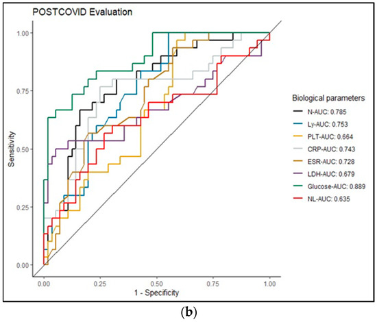 It is important to compare clinical parameters in COVID-19/PCI to estimate key biomarkers in the diagnosis and monitoring of the disease. The predictive threshold values for severity were obtained using ROC curves in our study. Thus, CRP, LDH and glucose can be considered important predictors in evaluating patients with COVID-19 (AUC > 0.7) (Figure 2). In the case of PCI, neutrophils, LDH, CRP and glucose can be considered important biological predictors (AUC > 0.7) (Figure 2b) in diagnosing patients. Many data in the literature have included age, male gender and comorbidities as major factors in the development of severe forms of COVID-19. Generally, individuals over the age of 65 and patients with multiple comorbidities have an increased risk of developing severe forms of COVID-19 and PCI [2]. The early identification of the risk factors associated with the development of the post-COVID-19 syndrome is essential in the management of these categories of patients. According to a systematic literature review and meta-analysis published by Notarte et al., which included a total of 12 articles with 677,045 COVID-19 patients, the development of Long COVID-19 can be associated with the existence of prior medical comorbidities, especially pulmonary diseases, diabetes mellitus, obesity and organ transplantation. At the same time, older age, female sex and pre-existing medical conditions can be predictors of long COVID-19 symptoms [26].