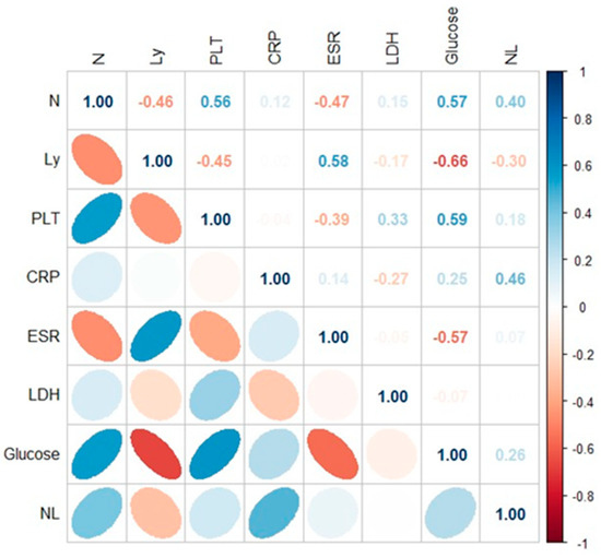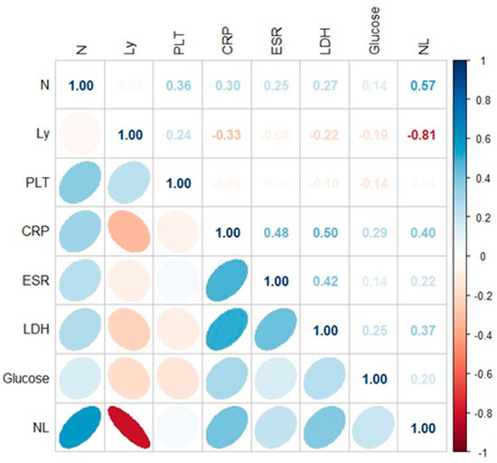 Spearman’s rank correlation coefficient was used to measure the strength of the correlations between biochemical and hematological parameters corresponding to the patients with COVID-19 (Figure 3) and PCI infection (Figure 4). A p-value less than 0.05 was considered to indicate statistical significance. Significant positive correlations were observed between biochemical and hematological parameters in case of COVID-19 patients (CRP × N/L (r = 0.40; p < 0.05), CRP × LDH (r = 0.50; p < 0.05); ESR × LDH (r = 0.42; p < 0.05); LDH × N/L (r = 0.37; p < 0.05). In the case of patients with PCI, the following correlations were identified: Ly × glucose (r = 0.66; p < 0.05); N × glucose (r = 0.57; p < 0.05); PLT × glucose (r = 0.59; p < 0.05); CRP × N/L (r = 0.46; p < 0.05) (Figure 3 and Figure 4).