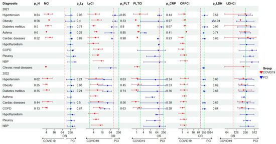 Regarding comorbidities, approximately 42% of the investigated patients have at least one comorbidity, with the most common being arterial hypertension both in patients with COVID-19 and in those with PCI. Obesity was the most common in patients with PCI and diabetes mellitus was predominant in patients with COVID-19 (Table 1). A forest plot was created to describe all the biological parameters with high importance in COVID-19/PCI in the case of associated comorbidities (Figure 5). It was observed that LDH values have statistical significance (p < 0.005) in the case of patients with COVID-19 and obesity evaluated in 2021, while the number of Ly shows a statistical significance (p = 0.05) in patients with PCI and hypertension, investigated in the year 2021 (Figure 5).