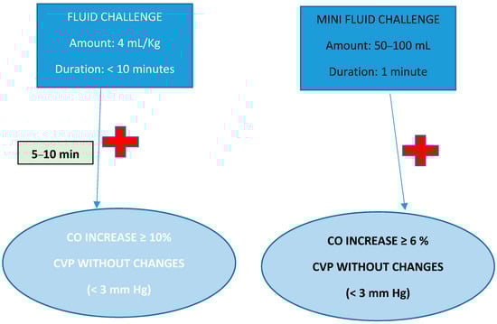 (1) Fluid challenge: This consists of administering small amounts of volume (4 mL/kg) for a short period of time (<10 min), monitoring the effects produced in CO or derived variables after 5–10 min [] The patient is considered to be fluid responsive if there is a ≥10% increase in CO with minimal variations in the CVP (<3 mmHg). “Mini Fluid Challenge”: Smaller amounts of volume (50–100 mL) are used for 1 min with a 6% increase in CO > 6% [] (Figure 1).