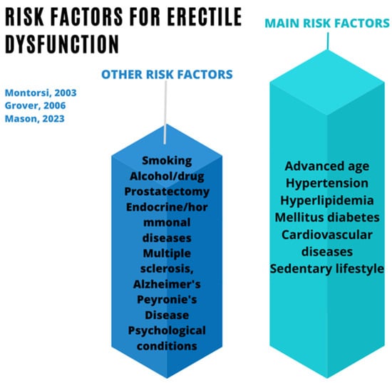For many years, it has been assumed that ED is a common process of aging, in which many men normalize their loss of sexual function [5]. However, apart from advanced age, obesity, hypertension, hyperlipidemia, diabetes mellitus, and cardiovascular diseases are the main risk factors for the development of ED [6,7,8]. These risk factors, along with other factors associated with the onset of ED described by other authors, can be found in Figure 1 [6,7,8,9].