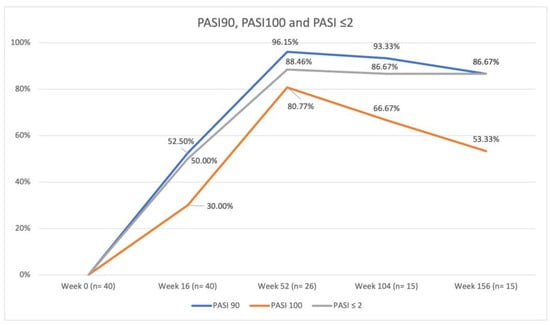 The mean PASI was 31.60 (SD 2.57) at baseline, 3.48 (SD 4.13) at week 16, 0.58 (SD 1.70) at week 52, 0.77 (SD 1.66) at week 104, and 1.29 (SD 2.12) at week 156. PASI90 and 100 were achieved by 52.50% and 30.00% of patients at week 16, by 96.15% and 80.77% at week 52, by 93.33% and 66.67% at week 104, and by 86.67% and 53.33% at week 156, respectively. PASIs ≤ 2 were reached by 50.00% of patients at week 16, 88.46% at week 52, 86.67% at week 104, and 86.67% at week 156. The differences in PASI90, PASI100, and PASI ≤ 2 responses between the anti-IL-17, anti-IL-23, and anti-IL-12/23 subgroups were not statistically significant.