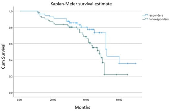 Kaplan–Meier survival curve between responders and non-responders from 6 months to the end of follow-up.