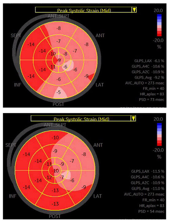Based on a previous publication [18], we performed a subgroup analysis looking at patients with >25% reduction in NT-proBNP concentration and concomitant > 30% improvement in GLS. All patients fulfilling those criteria belonged to the responder group (n = 45). Notably, compared to the remaining responders (n = 59), the mortality rate was comparable; however, fewer patients achieved the primary endpoint during follow-up (7 versus 24, p < 0.001). Figure 3 presents an example of GLS improvement in a CRT responder.