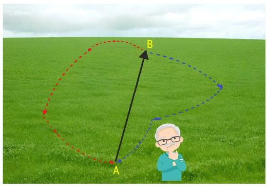The human navigation system naturally encourages the strategic translation of egocentric and allocentric information and the use of path integration. People ordinarily use egocentric navigation strategies during visual–spatial tasks such as walking a familiar route many times [6]. The egocentric navigation strategy is self-centered and involves the encoding of spatial information in relation to the position of the navigator. It is also based on different cues, allowing individuals to navigate as follows: perpetual processing of visual landmarks by bodily movements (e.g., “Turn left at the church”, “Turn right at the supermarket”, and then “Go straight to the pharmacy”), an endogenous integration of sensorimotor stimulation, vestibular information, and self-motion [6]. By contrast, when people travel a novel route, egocentric spatial representations are not available, and world-related navigational strategies are employed (i.e., allocentric navigation). They allow individuals to mentally represent a “cognitive map” of the environment based on the relationships among landmarks. This navigation strategy is also referred to as “wayfinding” [7]. Remarkably, they permit the travelling of alternative routes to come back to the starting point [6]. Further, when people are able to use urban environmental landmarks, they can successfully navigate thanks to the translation of spatial information from allocentric to egocentric strategies and vice versa (e.g., “I am 20 m from the pharmacy” and “The pharmacy is to the right of the supermarket”) (cf., [6]). Path integration, which is based on idiothetic cues, is the ability to transform internal information into a sense of location and orientation [8]. Self-motion cues (vestibular, proprioceptive, and motor information) are combined together to allow individuals to continuously estimate their position and orientation in space [9]. When participants walk blindfolded and with ear plugs, or when the environmental information is removed (with the exception of the optic flow alone), for example, in virtual reality tasks, it is possible to isolate idiothetic information from allothetic information [10]. Allothetic navigation, in turn, uses landmarks and boundaries to successfully navigate the environment [11], and pure allothetic navigation can be detected through desktop-based virtual reality tasks only [12]. Pure path integration (PPI) is particularly important because it permits the estimation of distances and the navigation of environments without using boundaries and landmarks. PPI can be studied both in virtual tasks, providing the navigator with a scenario bare of boundaries and landmarks (Figure 2), and in real-world settings thanks to the use of idiothetic indexes, as in the case of the triangle completion task [10]. However, in our daily experience, path integration and allothetic strategies are used jointly to derive location and direction. Some studies have shown that providing allothetic information during path integration tasks or vice versa can improve people’s orientation ([8,13,14]).