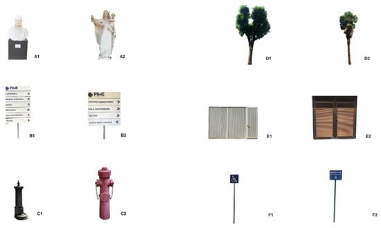 The participants are asked to complete a path from a start point (Figure 4, green point) to a destination point (Figure 4, blue point) in Route A (80.5 m) (Figure 4, dotted red line, on a scale of 1 to 500) in the PIME outdoor garden under the experimenter’s guidance. An interfering cognitive task mimicking distracting urban stimuli (e.g., people chattering, cars horns, background noise, pedestrian crossing, recognizing someone on the street, receiving a phone call, etc.) will be provided by a smartwatch worn by the participants, who are required to touch the screen when it displays a specific colored shape among different shapes presented with an interval of 15 s from each other. During this path, they are also required to remember all the existing landmarks as a cognitive exercise useful for the evaluation of spatial episodic memory. Once at the destination, they are asked to put in order the encountered landmarks (Figure 5), randomly presented as a written naming list on the experimenter’s smartphone App. In case of a sudden technology breakdown, an algebraic calculation (i.e., “Please, subtract 7 from 100 and keep going until I stop you”) and a different landmarks reordering (i.e., presentation with flash cards) will be provided by the experimenters as replacements. The landmarks will be mixed up with distractors in order to detect hits and false alarms. Then, they are required to navigate back to the original start point using the same route. This first task requires participants to predominantly utilize an egocentric strategy based on a navigator-centered representation of the environment.