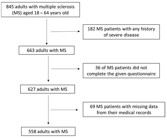 During their thorough recruitment, 182 (21.5%) enrolled adults diagnosed with severe, untreated, chronic disease symptoms like cardiovascular diseases, cancer, metabolic disorders, autoimmune diseases, or neurodegenerative or mental health disorders were excluded from the survey. From the remaining 663 enrolled adults, 36 (5.4%) of them did not complete all the questions of the given questionnaire or interrupted the interview, while for another 69 (10.4%) MS patients there were some missing data from their medical records. Finally, 558 adults diagnosed with MS were included in the study with a final response equal to 66.0%. A flow chart diagram of study enrollment is depicted in Figure 1. Collectively, by applying the main inclusion criterion, the randomly enrollment of adults aged 18–64 years old were collected. As main exclusion criteria, the presence of any severe chronic disease, the non-completion of all questions of the given questionnaire, the interruption of the enrolled participants during interviews, and missing data from the participants’ medical records were applied.
