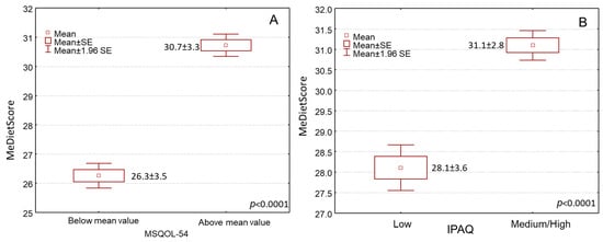 By treating MD compliance as a continuous variable (MedDietScore), we found that patients with higher levels of the MedDietScore were significantly associated with having no depressive symptoms compared to those with lower MedDietScore levels (Figure 2A, p < 0.0001). Accordingly, higher MedDietScore levels were significantly found in patients with reduced-disability MS disease (estimated by EDSS) than those with advanced-disability disease (Figure 2B, p < 0.0001). In addition, a greater MD compliance was considerably associated with a better quality of life estimated by the MSQOL-54 (Figure 3A, p < 0.0001). In addition, an elevated MedDietScore was considerably more frequently noted in MS patients with higher physical activity levels (Figure 3B, p < 0.0001).