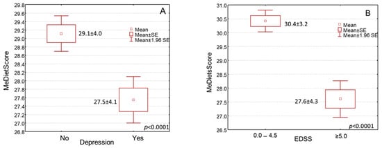 Box and whisker plots of MedDietScore with (A) depression and (B) the Expanded Disability Status Scale (EDSS).