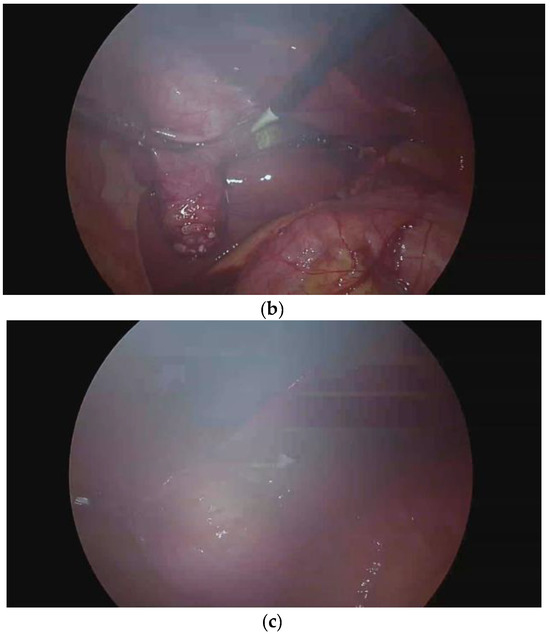 Laparoscopic view score. (a) Score 1: the laparoscopic view is clear. (b) Score 2: the laparoscopic view is slightly blurry. (c) Score 3: the laparoscopic view is completely blurry.